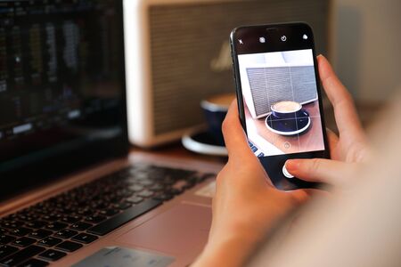 Close-up female hand using smartphone taking a cup of coffee for Post upload file to online on Internet .