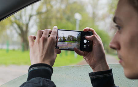 Close up of smartphone taking photo of beautiful tourist landscape in Sant-Petersburg