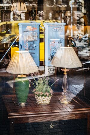 Barcelona, Spain - 14 Nov 2017: Two vintage table lamps with lavender flower in pot between them for sale in J. Marti MSa gift lighting equipment decoration store