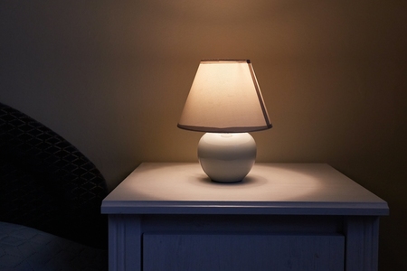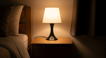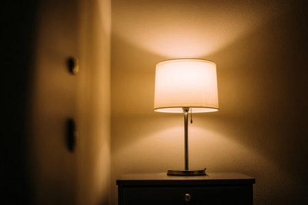 A table lamp stands centered on a nightstand, its white lampshade casting a warm, inviting glow. The lighting creates a soft atmosphere against the neutral-colored walls. This image shows a simple indoor scene, suitable for use in design, editorial features, or creating website content.