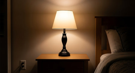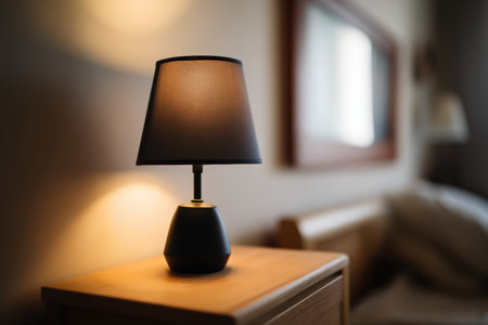 Elegant black lamp sits on wooden bedside table, softly illuminating the room with warm light. Out of focus in the background, a bed and large mirror add depth to the cozy setting