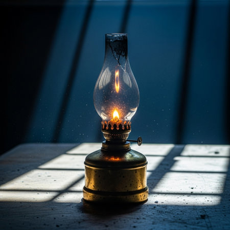 Lit vintage oil lamp providing warm, focused light, contrasted dramatically by harsh cool window sha