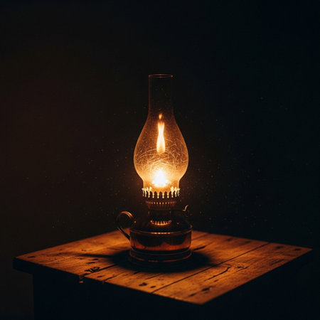 A wide angle, cinematic editorial photograph featuring an antique kerosene oil lamp burning vibrantl