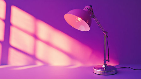 A stylish desk lamp in a vibrant purple hue radiates warm light, creating striking shadows on a soft surface in a chic interior setting.