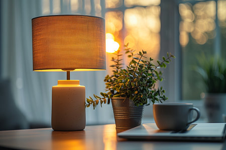 Tabletop Lamp Illuminates a Cozy Evening Setting With Plants and a Cup of Coffee