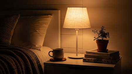A bedside night scene showcases a lit lamp, a cup, a small plant in a pot, and stacked books. The warm light from the lamp illuminates the items creating a cozy atmosphere. The composition presents a soft texture. Suitable for home decor, lifestyle, or design-related visual content.