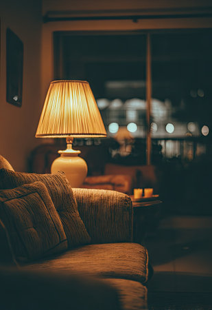A close-up captures a warmly lit living room at night. An elegant lamp illuminates a comfortable sofa, highlighting the textures and colors of the furniture. The composition emphasizes the soft lighting and shadows, suggesting a peaceful, interior setting. The image is suitable for various commercial uses related to home decor and ambiance.