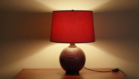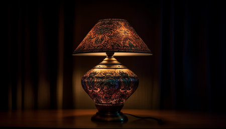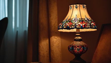 A beautiful table lamp emits warm and vibrant colors, creating an inviting atmosphere in a serene interior. The shadows add a touch of artistic flair.