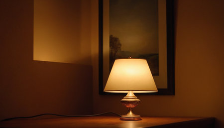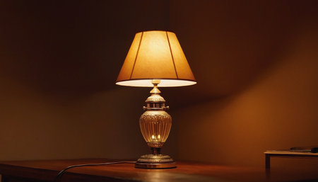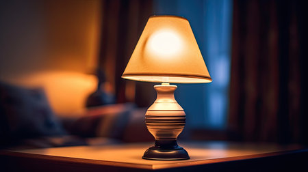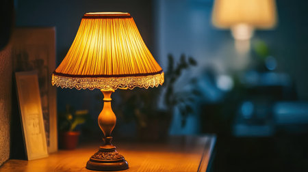 A table lamp with a lampshade stands on a wooden cabinet, casting a warm light. The image features a dark background, highlighting the lamp's design and illumination. The composition suggests an indoor setting, likely at night, suitable for commercial projects, decor concepts, and editorial use.