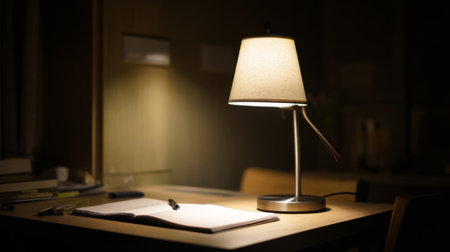 A softly lit workspace features a stylish desk lamp illuminating an open notebook, inviting creativity and reflection in a calm and cozy environment.