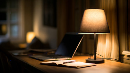 A tranquil workspace featuring a modern laptop and a stylish lamp, casting a gentle glow that enhances the cozy environment ideal for evening work and relaxation.