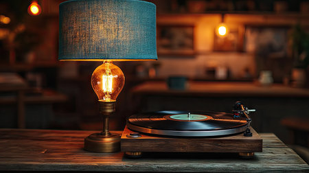 Vintage turntable with a teal lamp shade, a wood base, and brass legs, with a warm light bulb illuminating a vinyl record on a wooden table in a coffee shop. --chaos 30 --ar 16:9 --stylize 750 --v 6.1 Job ID: 46047559-2d09-451e-a38b-6e88477bc3a6