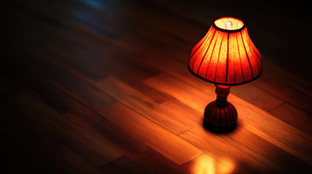 A charming vintage table lamp casts a warm and inviting glow on a polished wooden floor. This cozy lighting creates a peaceful ambiance, perfect for any evening setting.