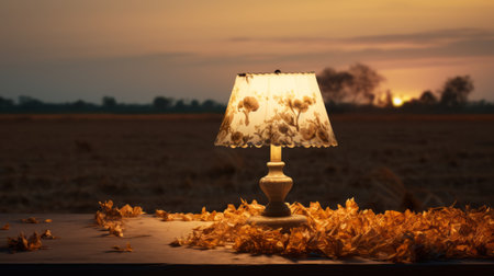 an old light shade and driftwood on a table sitting on a field, captured in the style of photorealistic fantasies. the image showcases a combination of beige and amber tones, depicting a serene night scene with detailed foliage. this uhd image evokes romantic themes and highlights the beauty of the composition. ai generated