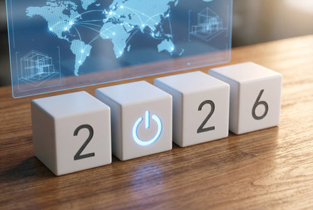 A close-up shot presents a circular blue button with the year 2026 imprinted on its surface. The button is set within a metallic ring against a dark backdrop. The composition is highly detailed, emphasizing texture and color. Suitable for commercial projects that discuss future, planning, or technological progress.