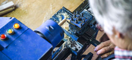 Carpenter man is carving the wooden stick. Spinning wood wheel machine. Trimming forming a round detail. Joiner is using metal tool to make the handmade decoration at workshop.