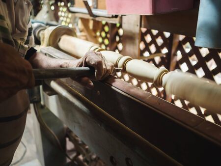 Hands of carpenter turning wood on lathe machine in carpentry workshop