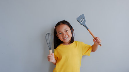 Little asian girl wearing yellow t-shirt holding kitchen utensils on grey background