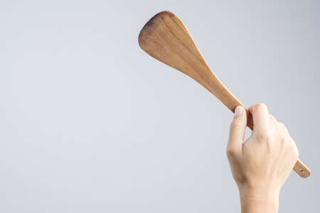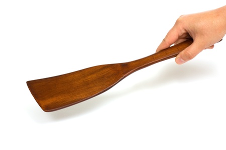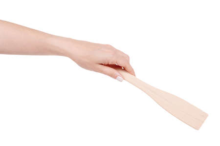 Hand holding wooden spade, spatula or flipper for frying pan on white background