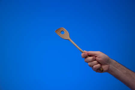 Used wooden kitchen spoon with long handle held in hand by man. Close up studio shot, isolated on blue background.