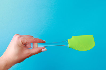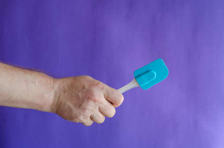 Kitchen silicone spatula in hand. A male hand holds a kitchen spatula with a plastic handle on a blue background. Selective focus.