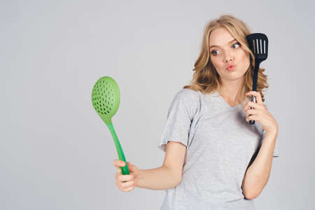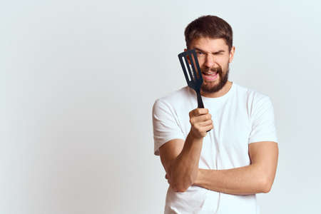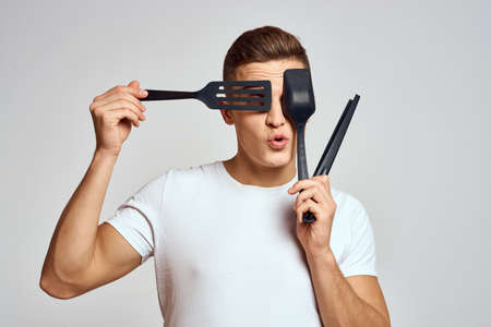 Guy with kitchen tools in hands on a light background cropped view of emotions fun model