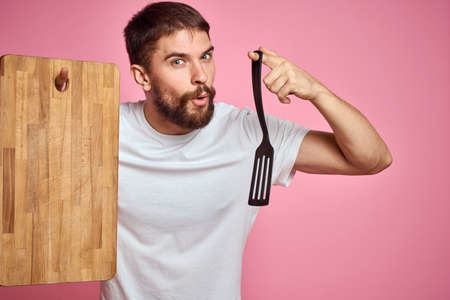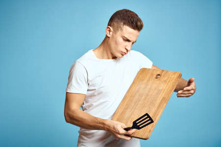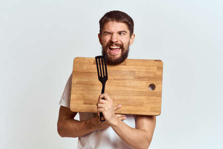 Man with a kitchen wooden board and with a shovel on a light background emotions white t-shirt model