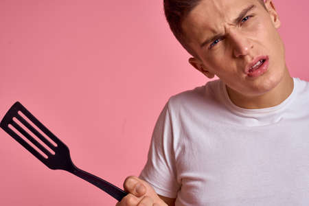 Man with spatula in hands kitchen accessories model emotions pink background cropped view Copy Space