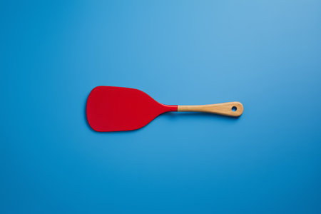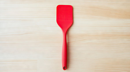 Single red kitchen spatula with heat-resistant silicone head placed on a light wooden surface background