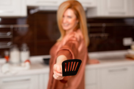 A joyful woman in a light apron smiles brightly while holding a wooden spoon, embodying a love for cooking and the pleasure of culinary creativity in her kitchen.