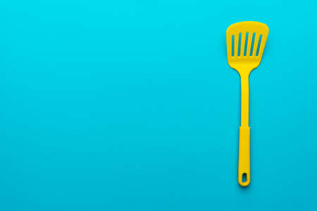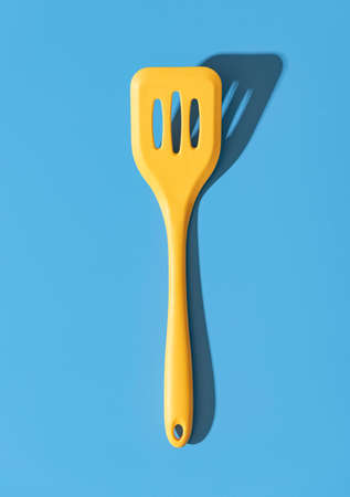 Above view with a yellow silicone spatula on a blue-colored table. Single spatula in bright lightminimalist on a blue background.