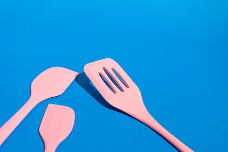 Kitchen tools. Kitchen spatula and brush on pink blue pastel background. Minimalism. Top view