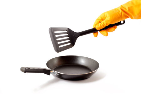 Non-stick frying pan and metal fork with wooden spatula. Risk of damage to the coating.