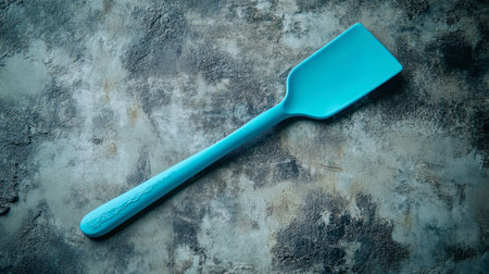 A silicone spatula in teal blue laid flat on a textured concrete background