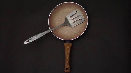 Close-up picture of frying pan with spatula and knife as kitchen utensils for cooking concept