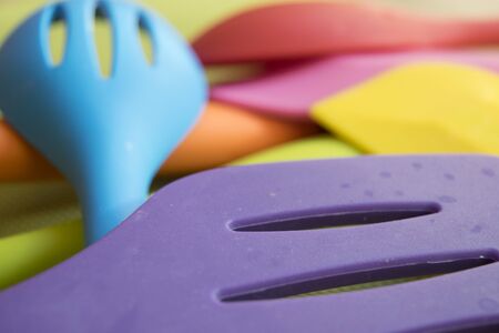 Two-tone kitchen silicone spatula on a two-tone background. Creative kitchen utensils.