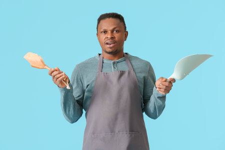 guy holding kitchen board and spatula in hand on pink background cropped view