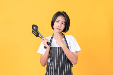 Happy young asian woman wear on an apron and hands showing spatula on light orange background.