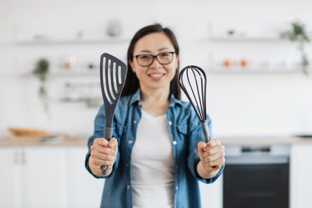 Excited Asian woman holding cooking utensils and smiling, isolated on white background
