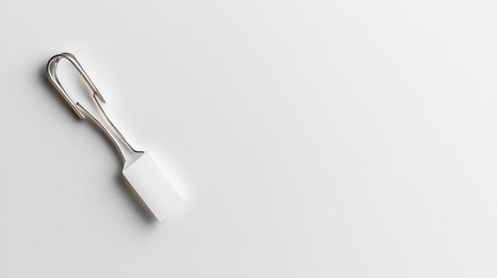 A simple metal hook with a white handle rests on a clean surface, showcasing modern design and utility. Ideal for various organizational uses and photography.