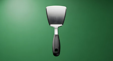 Minimalist image of a single black kitchen spatula placed on a smooth beige background