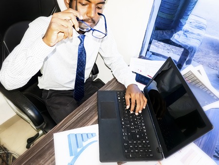 Young beautiful indian adult working in office with spectales in the hand in front laptop and sheet of finance graphs. Full concentration at work, eyes troubles with screen