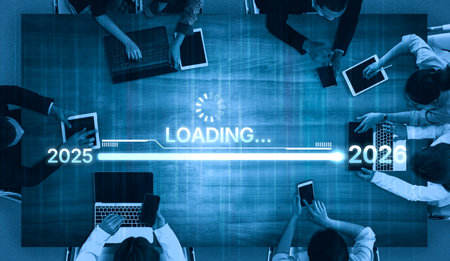 Visualizing the shift from 2025 to 2026. Progress bar symbolizing advancement, strategic foresight, yearly goal-setting, and business transformation for the upcoming year. Spline