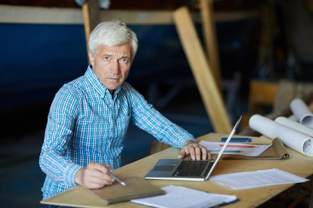 Comfortable office room and caucasian student in black sweater sitting at table there is his working laptop for education.
