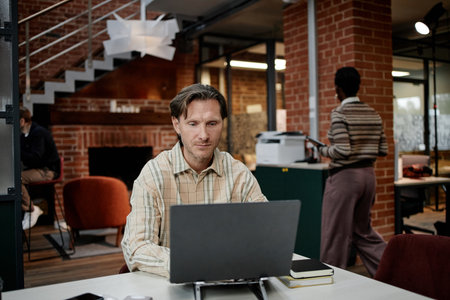 Caucasian middle aged man working on laptop at desk in modern business office while Black woman standing near printer in background, both focused on professional tasks, open workspace visible