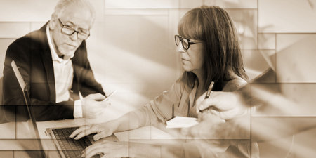 Image of financial data processing over diverse business people in office. Global finance, business, connections, computing and data processing concept digitally generated image.