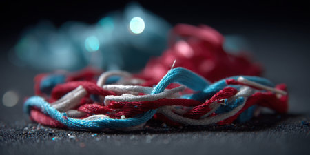 A visually striking close-up of red, white, and blue threads layered on a dark surface, accented with sparkling elements, showcasing texture and creativity.