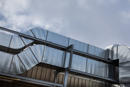 ventilation pipes of industrial building outdoor, against the sky