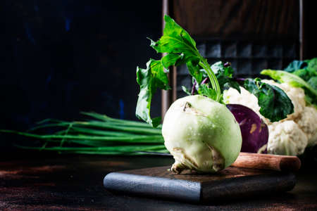 Kohlrabi on a wooden table. Delicious cabbage close-up, healthy eating.