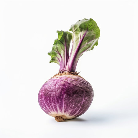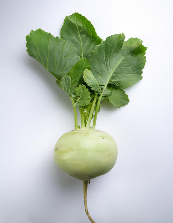 Fresh turnip with leaf, isolate on white background. Macro studio shot. Useful vegetable, dietary vitamin. AI generated.